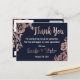 Elegant, chic och enkel, modern utskrift av blommor och typografi i ro guld på den moderna marinblå bakgrunden, Tack Postcard. Denna klassiska och sofistikerade utformning är perfekt för alla snyggtar och trendig, inklusive bröllop och dagligt tillfälle. Alla fotoutskrifter.