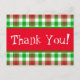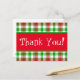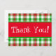 Skicka ett tack med det här röda, vita och grönt-vykortet. Har en röd remsa över mitten med "Tack!" text i vitt brev.