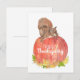 Den här höstliga vykortet har akvarellkonst med en fräck ekorre som slappnar av på toppen av en snygg orange pumpa i en hög med färgglada löv. Förbered dig för Thanksgiving med denna söta originalkonst av Tiffany Duffy. Perfekt för att önska dina vänner och familj en glad Thanksgiving när du inte kan fira högtiden tillsammans. Anpassa med dina egna texter eller låt det vara som det är. Bli festlig med detta mysiga kort och rama in det för en söt och originell heminredning!