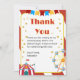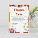 Tacka dina gäster med detta matchande tackkort med karnevalstema! Designat för att perfekt komplettera inbjudningarna, har detta kort djärva, festliga färger och klassiska nöjesparksikoner. Det är det perfekta sättet att uttrycka din tacksamhet för gåvorna och för att ha hjälpt till att göra födelsedagsfirandet så roligt. Kortet är helt anpassningsbart för att lägga till ett personligt meddelande och barnets namn.