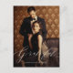 Elegant vit bröllopskort med tackmeddelande och returadress på baksidan, och ett foto med kalligrafisk tacksam text på framsidan. Skicka dina tack till era bröllopsgäster för deras närvaro på er speciella dag med detta klassiska fotokort.