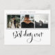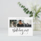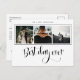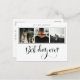 Fotocollage med tre bröllopsfoton och snurrig ”Bästa dagen någonsin”. Speciell anteckning till era gäster på baksidan. Typsnitt, fotoram och hjärta på baksidan kan ändras till era bröllopsfärger eller spegla er personliga stil.