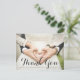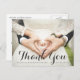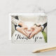 Detta tackkort för bröllopsfoto har ett stort foto från ditt bröllop med "Tack" i mörkgrå kursiv text och ditt eget meddelande på baksidan.