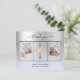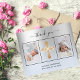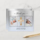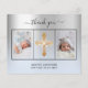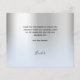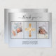 Lägg till 3 av dina bilder, stående format, ett datum, namn och tackmeddelandet. En ljusblå gradient och falsk silverfärgad bakgrund med svart text och ram. Texten: Tack på framsidan och ditt namn på baksidan är skriven med en stilren handskriven stil med svängiga linjer.