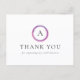 Modernt tackkort för affärer med en enkel men professionell design med ditt monogram inuti en rosa och lila cirkel.
