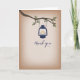 Ett tackkort med en illustration av en blå campinglykta som hänger från en trägren med gröna blad. Texten på framsidan lyder "Tack". Bakgrunden är inspirerad av kartong. Insidan är tom. Detta kort kan också köpas i mindre storlek som notisblock. Hitta matchande bröllopsinbjudningar och mer hos Jill's Paperie.