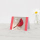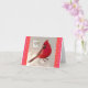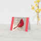 Den male kardinalen med hans ljusa färg är en favorit- fågel för min kort.