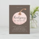 Inbjudningskort för fantasifull tackmiddagsfest med en illustration av en rosa pumpa på brun bakgrund.