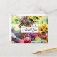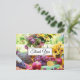 Tack-kort med ett fotografi av traditionen för högtiden tacksägelsedagen. Ett bord dukat med överflöd, skördevegetabilier och frukter.