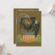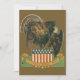 En vintage-illustrerad tacksägelsepostkort med en kalkon och en vitörad havsörn och amerikansk flagga med texten "Tacksägelsedagen."