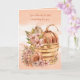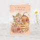 Religiöst tackkort i akvarell med en korg med pumpor och blommor med känslan på framsidan som lyder "Jag tackar Gud varje dag för er."
