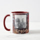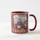 Mugg har en bakgrund av färglöst höst löv. Två foton av familjemedlemmar visas på vardera sidan om mugg. Över hela grund i ljusa orangen är färg ord "Familjetacksam". Fotografierna och texten är utformade för att vara personlig med dina egna foton och ditt eget ord om så önskas. Kontakta mig om du behöver hjälp med att anpassa dig.