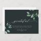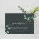 Kortet för snyggt, elegant, kalligrafi för affärsverksamhet visar GRATEFUL vid sidan av moderna illustrationer med eucalyptus vattenfärg, anpassningsbarnas text och meddelande. På baksidan finns utrymme för ett annat meddelande och företagets logotyp.