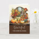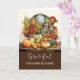 Den här tacksägelsekortet visar en fantastisk akvarellstilleben som fångar essensen av höstsäsongen. Pumpa, majs, zinnia och andra höstblommor står bredvid en rustik vas och lykta på ett trädgårdsbord framför ett mysigt fönster. De mjuka, naturliga färgerna inger värme och tacksamhet, vilket gör det till det perfekta kortet för att skicka hjärtliga tacksägelseönskningar. Med ett enkelt men meningsfullt budskap inuti är detta kort perfekt för alla du vill dela din tacksamhet med under den här speciella tiden på året. Perfekt för familj, vänner eller nära och kära nära och fjärran.