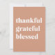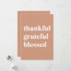 Dela julens anda med detta kort med texten "Tacksam Tacksam Salig" – en chic, minimalistisk design som förmedlar värme och betydelse i tre hjärtliga ord. Med en mjuk neutral bakgrund och fet vit typografi är det perfekt för att skicka meddelanden om tacksamhet till vänner, familj och nära och kära. Tryckt på högkvalitativt papper med ditt val av format och kuvert fungerar detta mångsidiga kort vackert för högtidliga hälsningar, tackkort eller som en elegant tillägg till din Thanksgiving- duk. Ett tidlöst sätt att sprida glädje, tacksamhet och kärlek denna höst.