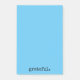 Ett blått klibbigt anteckningsblock med ord "tacksamhet" vid grund.