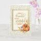 Tacksgiving-kort med ”Tacka med ett tacksamt hjärta” i en handskriven stil, omgivet av en krans av höstlöv och pumpor. Bakgrunden har ett subtilt mönster av löv och ekollon.