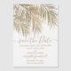Den moderna eleganten guld handflatan träd sparar datumet. Modern enkel faux guld handflatan träd med enkel typografi, ett trendig och tropisk räddar temat bröllop på handflatan träd löv med ändringsbar vit färg.