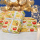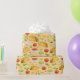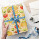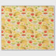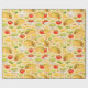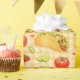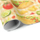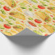 Seamless watercolor pattern featuring tacos nachos tortilla chips guacamole salsa lime slices tomatoes and bowls of dip arranged evenly on a warm yellow textured background