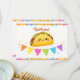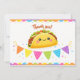 Bedårande ”Taco ’Bout a Baby” fiesta-babyshowerdesign med söta kawaii-tacot, avokado och kaktuskaraktärer med färgglada serape-accenter. Perfekt för en rolig mexikansk temafest.