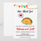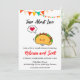 Fira din kärlek till tacos och det snart gifta paret med denna roliga och moderna akvarellinbjudan. Perfekt för en avslappnad och festlig bröllopsfest för par, denna design har en lekfull taco-illustration med hjärtformad fyllning, omgiven av livfulla akvarellstänk. Anpassa inbjudan med parets namn, festdatum, tid och plats.