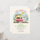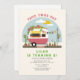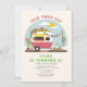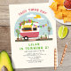 Taco temade "taco twosday" födelsedagsfest inbjudan med illustration av shock rosa och en vit vintage kamper för släpvagn taco lastbil med en papel picado kopplad till birch träd under en blå himmel med sol och moln. Camper är dekorerat med trädgårdsmark, pampas, kaktus och växter i terra cotta pots.