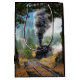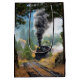 Lokomotiv nr 19färgbild av en nära ånga tåg på tåg-spåren som fakturerar grått-rök från dess stapel, spåret flankas av träd på vardera sidan