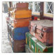 En enkel vattenfärgsdesign för tåg station under krigstiden. Suitväskor på plattformen som väntar på att ånga tåg ska transportera dem till deras destination. England.