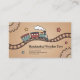 Ett affärskort för en trätillverkare i leksak med en illustration av en leende tåg som rör sig längs en linbana. Kortbakgrunden är en varm, övertonad, texturerad beige med subtila detaljer som träväxlar och handdragna stjärnor. Kortets utformning är professionell, vilket utesluter en varm, nostalgisk och hantverksmässig vibe som belyser hantverkets skicklighet och passion för leksak av trä.