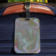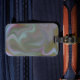 Ett bagagetagg täckt av ett tydligt, synligt, färgstarkt smam.
