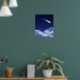 En poster vit stjärna flyger över mörken natten himlar över en kudde av fluffy vita moln nedanför.