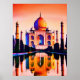 Poster i en illustration av Taj Mahal, som speglas i vatten, och backas upp av en djup korallagssolnedgång i himlar
