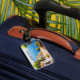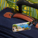 Luggage tag with a modern fine art painting showing a coastal Italian landscape on a beautiful sunny day.