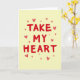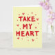 This card features the words “TAKE MY HEART” stacked in three lines right in the center. The background is a soft, pale butter-yellow that keeps the focus on the message. The letters are deep red and look hand-lettered with rounded edges and slight unevenness, like someone wrote it with care. Around the words, small red hearts are scattered in different sizes and shades, almost like they’re floating around the message. The overall look feels sweet and direct, without needing any extra details to explain what it means. It’s a meaningful card to give when you want to be brave about your feelings, whether it’s for a partner or someone you’re growing close to 🥰. The simple colors and little hearts make it feel warm and sincere, like a small promise you can hold onto ❤️. Hope it helps you share your Valentine’s Day feelings in a kind, honest way.