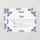 This Talavera Black Floral Minimalist Spanish Wedding RSVP Card design features a minimalist approach with delicate, symmetrical black floral motifs placed in each corner and along the edges. The small, leaf-like shapes create a sense of movement while maintaining an airy, open space in the center, allowing for ample text placement. The simplicity and elegance of the pattern evoke traditional Talavera tiles, giving the design a classic Mexican artisanal feel.
