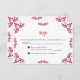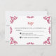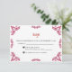 This Talavera Red Floral Minimalist Spanish Wedding RSVP Card design features a minimalist approach with delicate, symmetrical red floral motifs placed in each corner and along the edges. The small, leaf-like shapes create a sense of movement while maintaining an airy, open space in the center, allowing for ample text placement. The simplicity and elegance of the pattern evoke traditional Talavera tiles, giving the design a classic Mexican artisanal feel.
