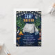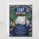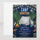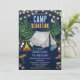 Gå över till ett episk födelsedagsäventyr! Denna fantastiska läger-tema födelsedagsinbjudan visar en magisk marinblå natthimmel med en halvmåne, lysande strängljus, höga tallar, ett klassiskt grått tält, knastrande lägereld med rostande marshmallows, lykta, vandringsstövlar, sovsäck, björnspår och en lägervägskylt — den perfekta scenen för en minnesvärd utomhusfirande.
