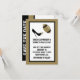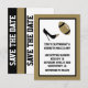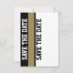 Roligt fotbollstema till bröllopet, Spara datum-kort gjort med en tan- och svart ram runt ett vitt textområde. Grafik med en stiletto-högklackad sko som sparkar en tan- och svart fotboll pryder den övre delen av kortet, med svart text nedanför. Baksidan är gjord i svarta, tan- och vita vertikala ränder med "Spara datum" i fet stil som löper vertikalt. Anpassa all text efter dina behov. Underbara Spara datum-kort för det fotbollskärande paret.