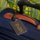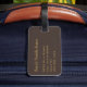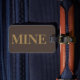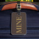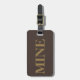 Bagagetagg med namn och adress med en "MINE" på en brun bakgrund färg. Anpassa med namn och adress-information med hjälp av de enkla mallarna.