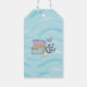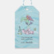 En söt sjöjungfru med lila hår och mynta grönt delfin vid märkrns framsida och en skattkista dekorerar baksidan. Anpassa med ditt barns namn och lägg till i festförmånspåsar.