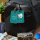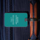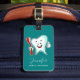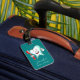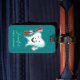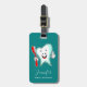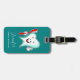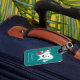 Ett bagagemärke med en illustration av en stor vit tandtand i tecknad som leker glatt med en röd tandborste och ge tummarna upp.