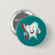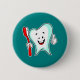 En knapp med en illustration av en stor vit tand i tecknad som leker glatt och håller en röd tandborste och ge tummarna uppåt.