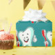 Svällning papper med en illustration av en stor vit tandtand i tecknad som leker glatt med en röd tandborste och ge upp tummarna. Mörk grönt bakgrund.