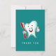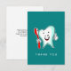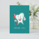 Ett kort med en illustration av en stor vit tandtand i tecknad som leende och glatt håller en röd tandborste och ge tummarna upp. Personlig på baksidan.