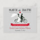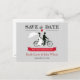 Tandem-cykelvykort bröllop spara datum med en silhuett av en brud och groom som kör en tandemcykel. Svart och vit design med röd banderoll och hjärta på en grått-bakgrund. Personlig med din information på det utrymme som finns. Hämta motsvarande Tandem-cykel Spara frimärket Datum nedan: