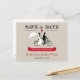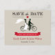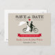 Tandem-cykelvykort bröllop spara datum med en silhuett av en brud och groom som kör en tandemcykel. Svart och vit design med röd banderoll och hjärta på en taupbakgrund. Personlig med din information på det utrymme som finns. Hämta motsvarande Tandem-cykel Spara frimärket Datum nedan: