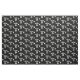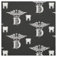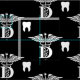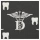 tyg som presenterar det universella symbolet för tandvård och en tand och ett diagonalt argt mönster på en svart bakgrund.