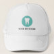 Tandläkarpraktik i tandvård truckerkeps med tandlogotyp. Lägg till en egen anpassningsbar-affärs-namn eller personlig-tandläkaroffert. Anpassadet färg. Gör egna hattar för anställda, personal, personal, chef, medarbetare, kollega, vänner, kunder, patienter osv. Modern symboldesign för tandsilhuette.