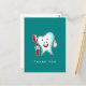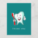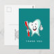 Tack så mycket för att du fick ett vykort med en illustration av en stor vit tand i tecknad som lekte glatt och höll en röd tandborste och ge tummarna upp. Gröntens bakgrund.