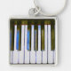 Studie i Blått - Det ursprungliga konstverket av ZoeSPEAK på denna nyckelring är en närbild av ett pianotangentbord, med en elektrisk blå highlight på de mörka pianotangenterna, och reflektioner av tangenterna i det mörkbruna träet längst bak. En tunn linje av mjuk röd separerar träet från tangenterna.